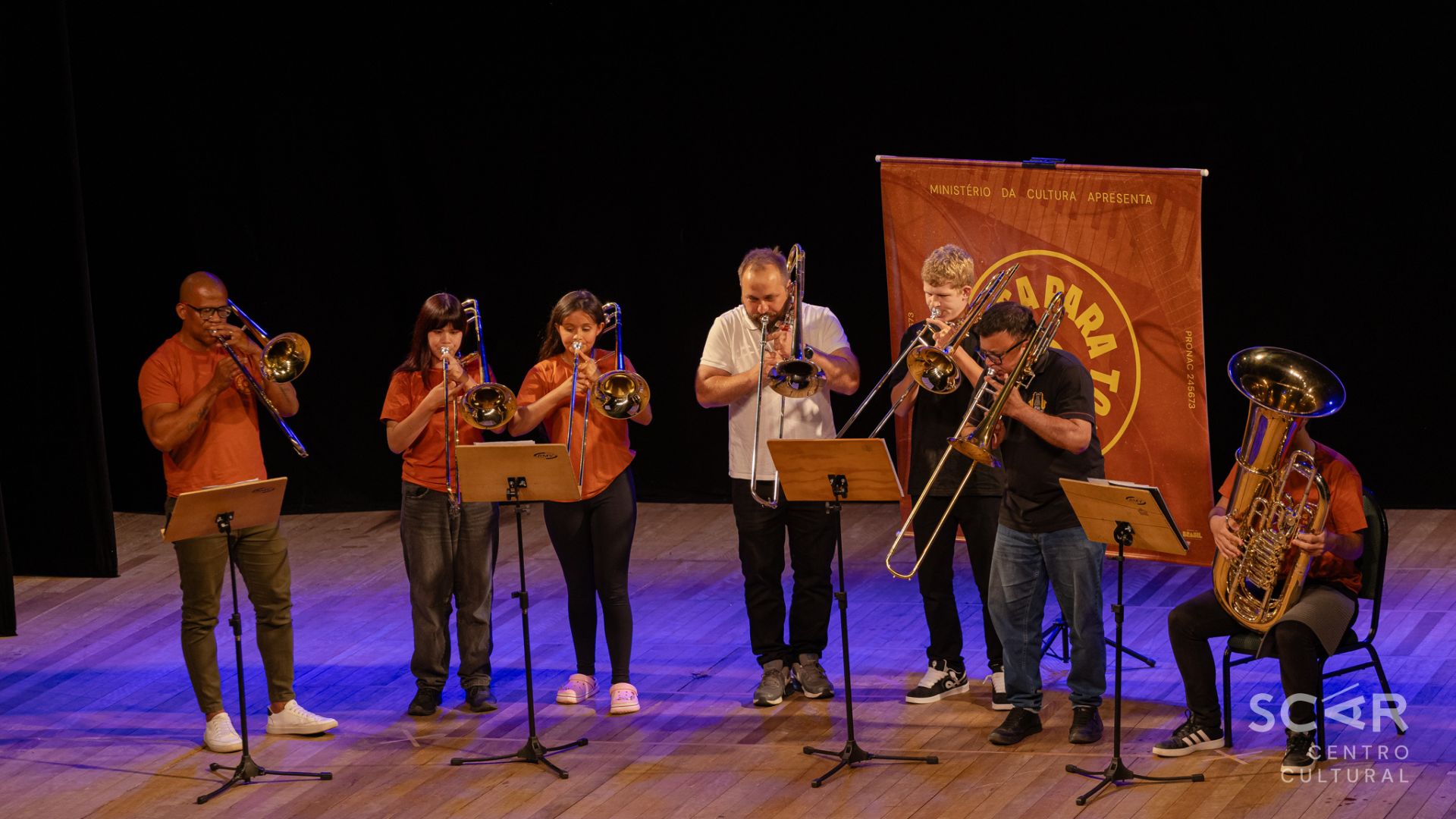 No dia 27 de fevereiro, os alunos de metais e madeiras do projeto Música Para Todos (MPT) ocuparam o palco do Pequeno Teatro da SCAR para uma prática artística especial. Trombone, trompete, tuba, trompa e saxofone deram voz ao que vem sendo construído aula após aula: dedicação, escuta e paixão pela música.